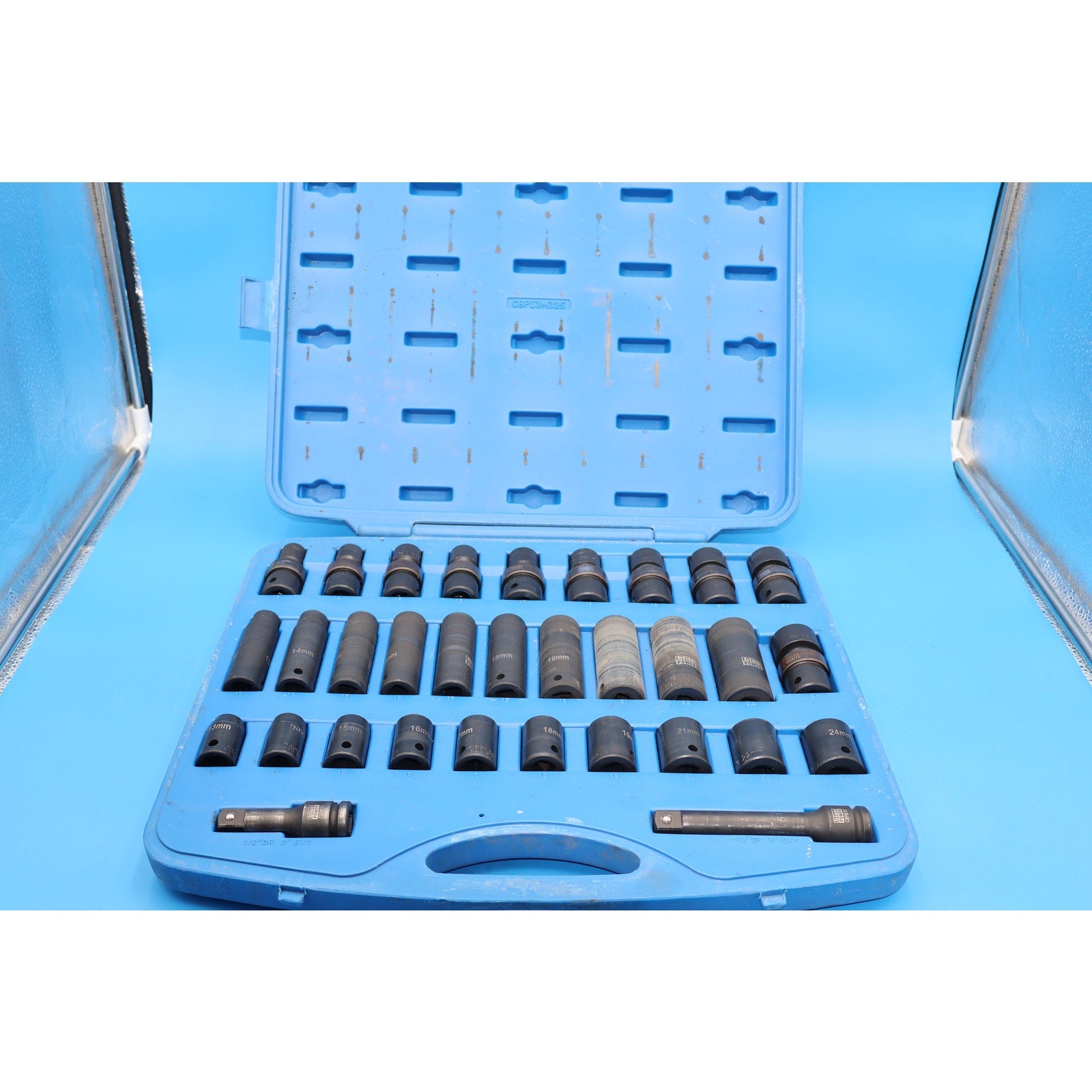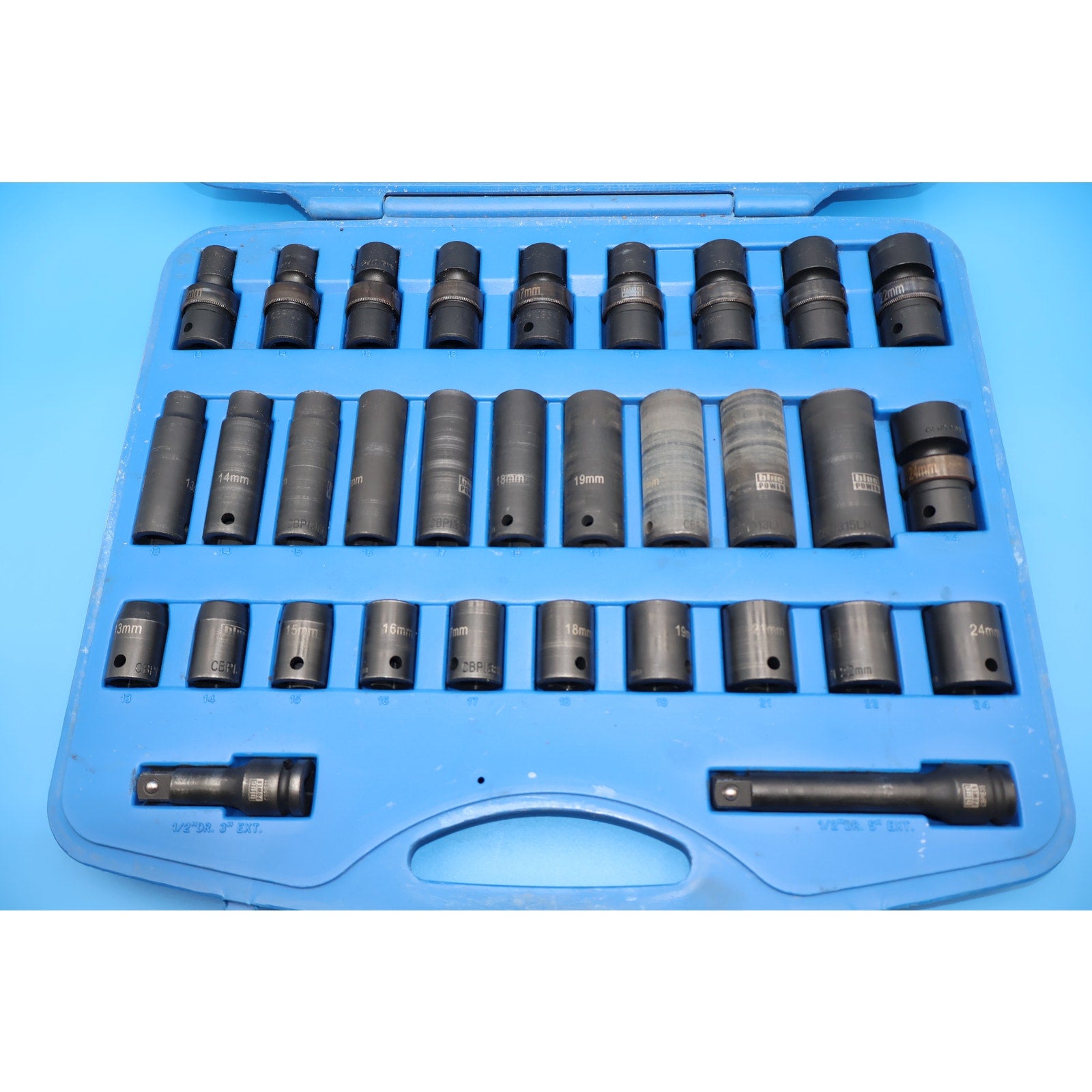 This is a pre-owned Cornwell CBPI3M32S 32-piece 1/2” drive impact socket set. It’s in good working condition with typical signs of use, including scuffs, scratches, and some grime on each piece—just normal wear from regular use. Nothing major or excessive.