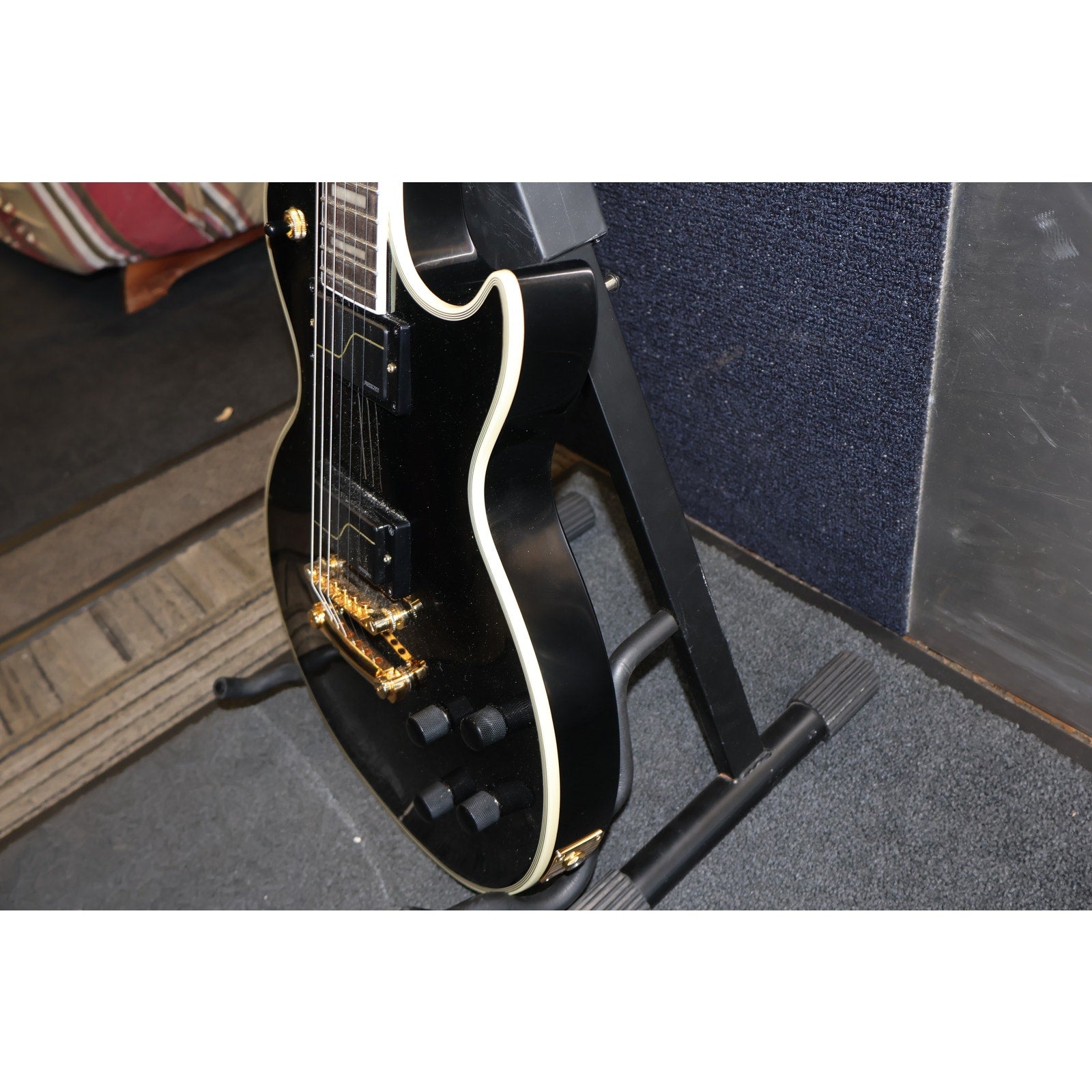 You are looking at an Epiphone Les Paul Matt Heafy MKH Origins Custom Electric Guitar in Ebony. This guitar is pre-owned but in good condition. It shows normal signs of use, including scuffs, scratches, and light grime throughout—nothing major or distracting, just average wear from regular play.