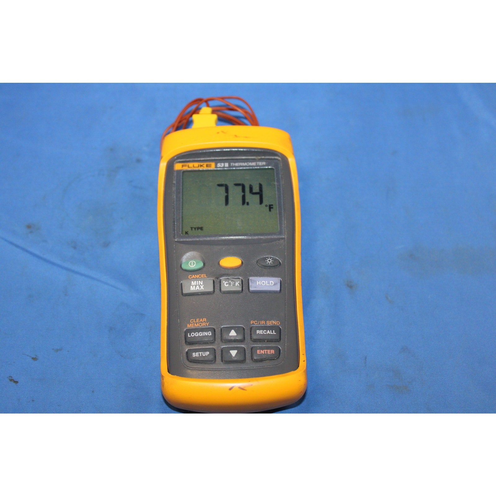 You are looking at a Fluke 53 II Digital Thermometer. It is used but in good condition. It does show signs of use with scuffs, scratches, and grime all around the Thermometer. Biggest blemish is the previous owner markings on the back. But nothing too major or too distracting. Just average wear and tear from normal everyday use. It has been tested and everything appears to be fully functional. It comes with the Thermometer, Rubber Case Cover, and Leads. What you see is what you get. Please look at all pictures before purchasing. 59896-1