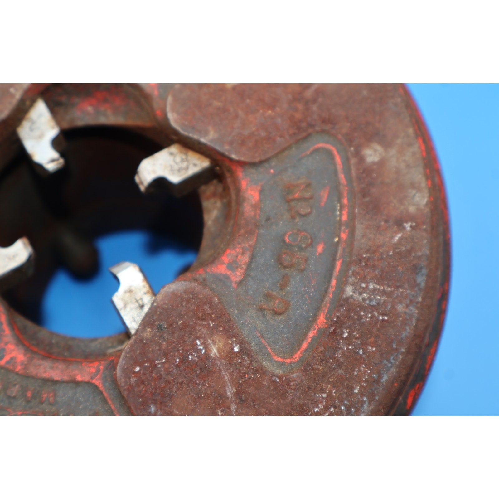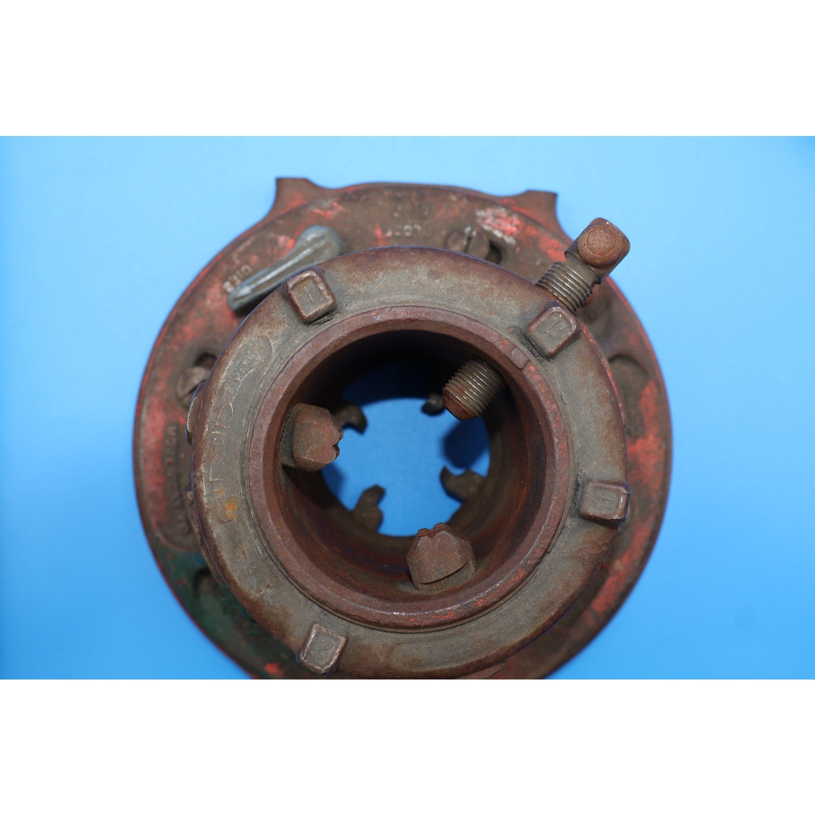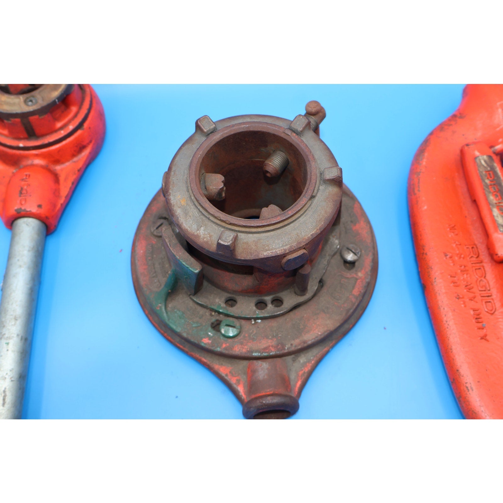 This set includes 3 ratcheting heads, a pipe cutter, and handles. All tools are used and in fair condition, showing noticeable signs of use, including scuffs, scratches, and surface grime. The 65-R shows more wear than the others, but all items exhibit typical wear from regular use and remain fully functional.